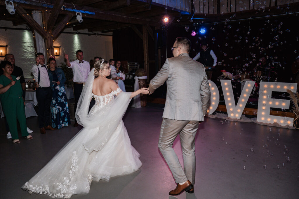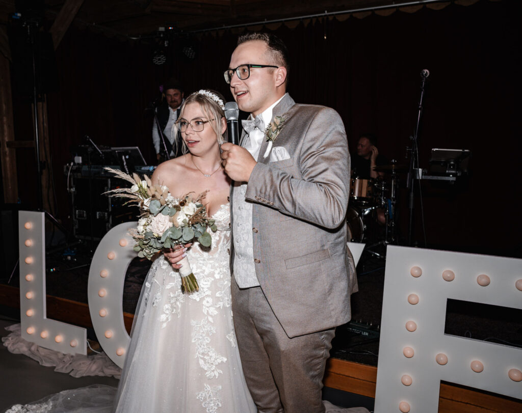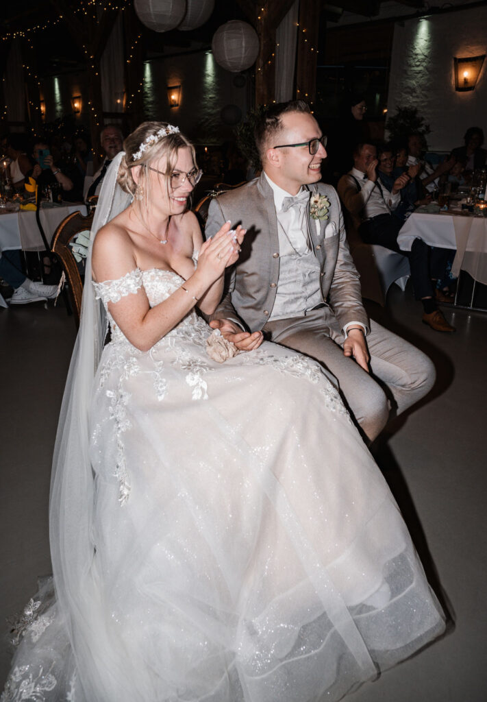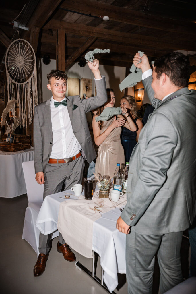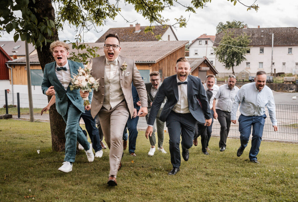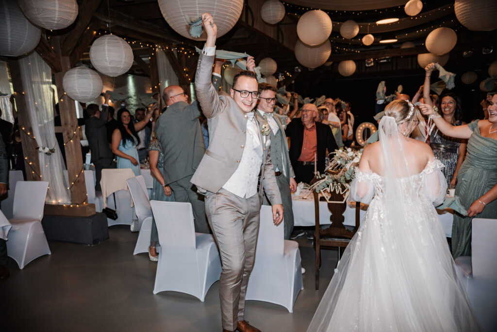 Nach dem Fotoshooting ging es weiter mit der Brautentführung im Dorfgemeinschaftshaus in Seidwitz – eine traditionell bayerische Überraschung, bei der die Braut von den Trauzeugen „entführt“ wurde. Das sorgte natürlich für viel Lachen und Aufregung unter den Gästen. Der Moment, als Emilia wieder „befreit“ wurde, war ein Highlight, das die Stimmung auflockerte und für viel Freude sorgte.