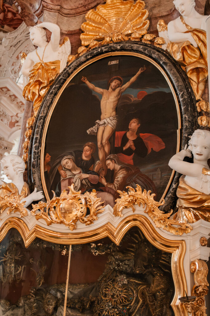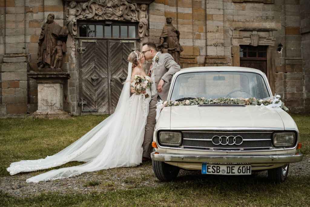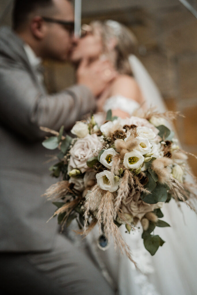 Der Hochzeitstag war wirklich gut durchorganisiert, aber auch ziemlich straff getaktet. Nach der Trauung ging es weiter zum Fotoshooting bei der Kirche Barbaraberg in Speinshart. Dieser Ort war der perfekte Hintergrund für romantische Hochzeitsfotos. Doch das Wetter spielte nicht ganz mit: Während wir im Freien unterwegs waren, zog plötzlich ein kräftiges Gewitter auf. Der Regen begann zu fallen, gefolgt von Hagel, was die Atmosphäre dramatisch und doch auch magisch machte.
