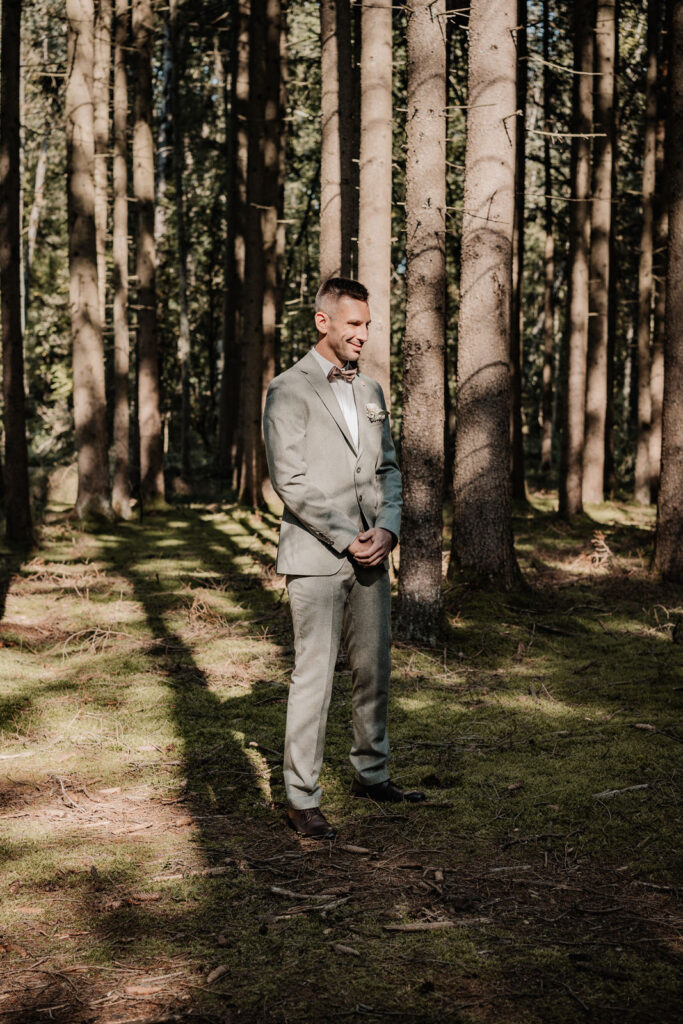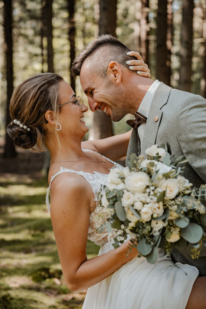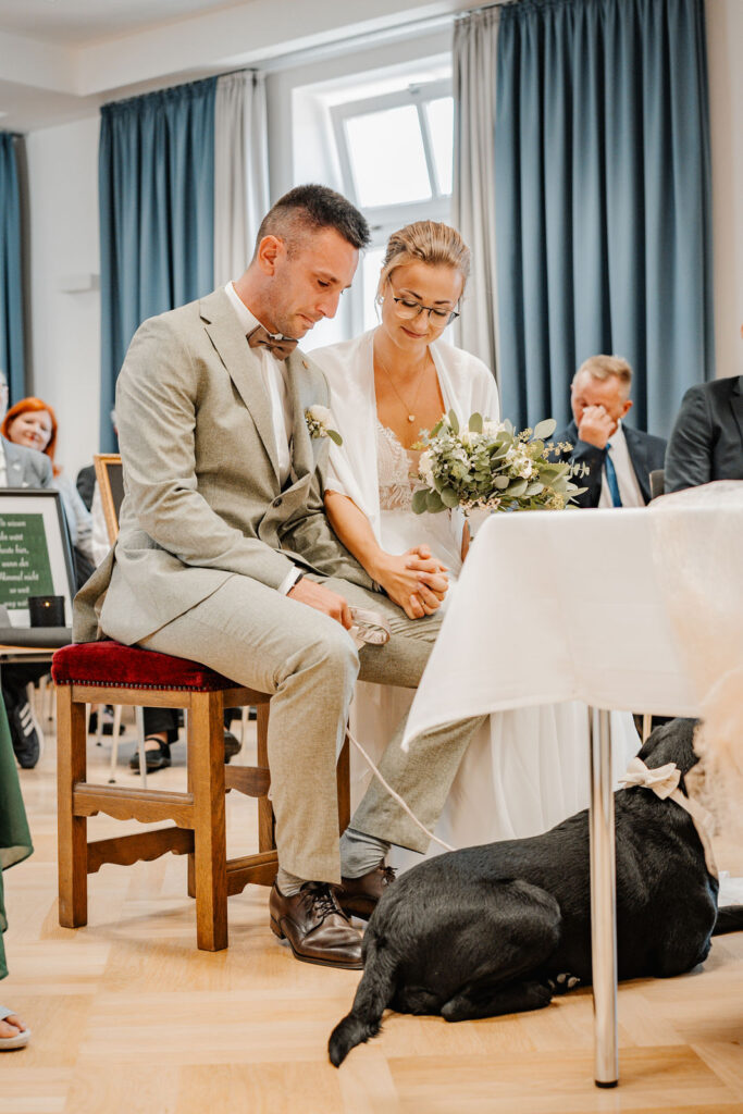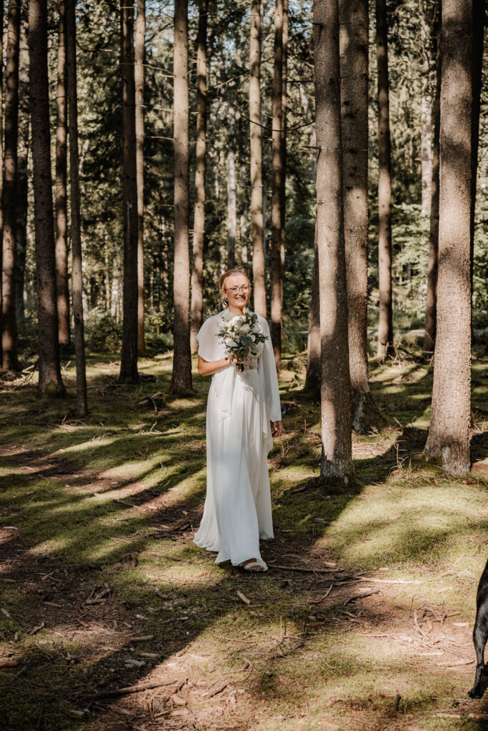Am 20. September 2024 begann der Hochzeitstag von Moesha und Marco mit einer ganz, intimen Zeremonie: dem First Look in einem nahegelegenen Waldstück. Es war ein sonniger Tag und die Sonne brach bereits durch die Bäume. Man spürte die Aufregung und Vorfreude der beiden, als Marco auf seine Braut zuging. Nachdem sich die beiden das erste Mal gesehen haben, tauschten Sie ihr Ehegelübde aus. Es war ein ganz intimer und wunderschöner Moment, da die beiden ganz für sich waren. Auch die Hündin Nale, die von Moesha in die Ehe gebracht wurde, hat einen persönlichen Antrag bekommen, was auch für wunderschöne Bilder sorgte.